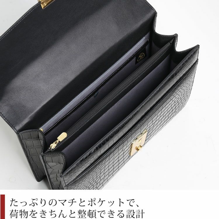 ゴールド金具のアクセントで高級感のあるクロコダイルセカンドバッグ。