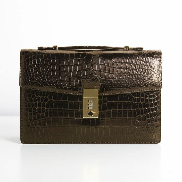 ナイルクロコダイルの腹部の革をセンター取りで使用したメンズビジネスバッグ。