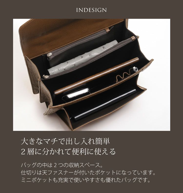 オーストリッチ革を職人が丁寧に仕上げ型崩れしにくい丈夫なバッグに仕上げました。