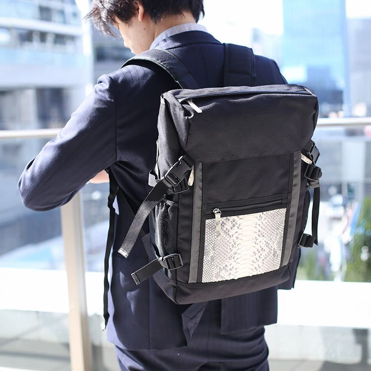ナイロンをベースにダイヤモンドパイソンのアクセントがおしゃれな四角いリュックサック。