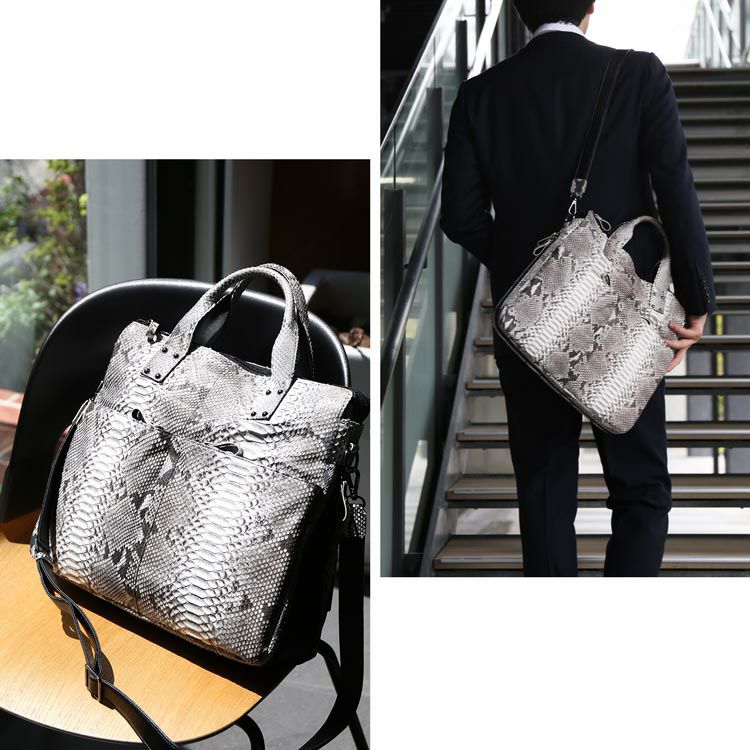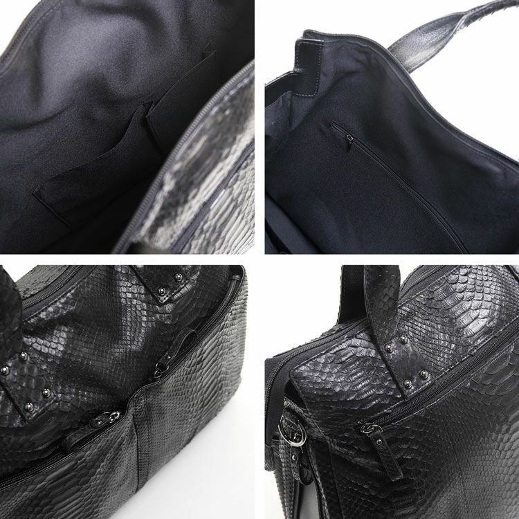 天然皮革 エキゾチックレザー ダイヤモンド パイソン メンズ トートバッグ ブリーフケース 2WAY ショルダーベル付き A4 対応 ビジネスバッグ ブラック/ナチュラル 旅行バッグ 本革 蛇革 プレゼント ギフト mensbag