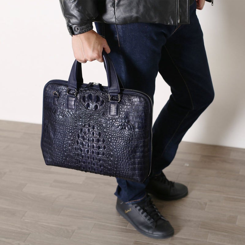 天然皮革 エキゾチックレザー クロコダイル ホーンバック ブリーフケース 2WAY メンズ ショルダーベルト付き ビジネスバッグ ラウンドファスナー A4 対応 マット 加工 背ワニ 通勤 mensbag