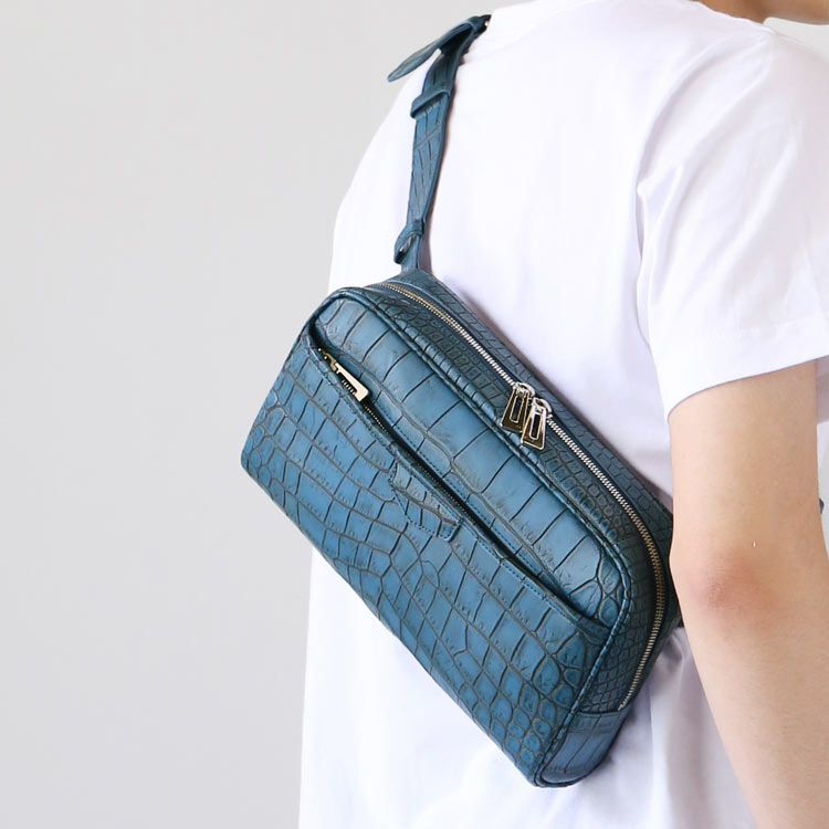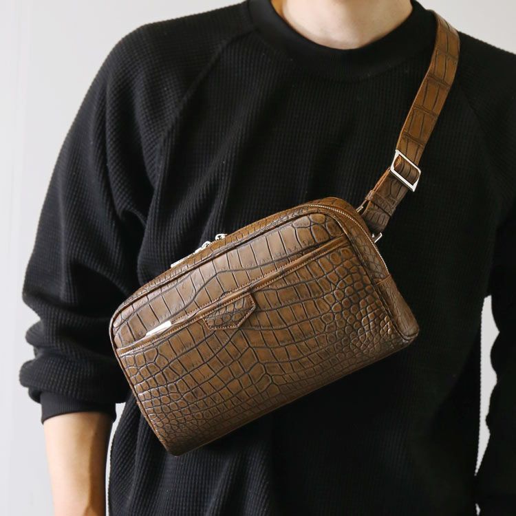 カジュアルなスタイルにも主役級の存在感を放つクロコレザーを使用したボディバッグ。