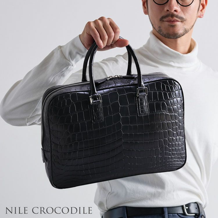 美しい漆黒のクロコダイルが男性の手元にエレガントな印象をプラスするビジネスバッグです。