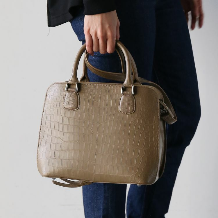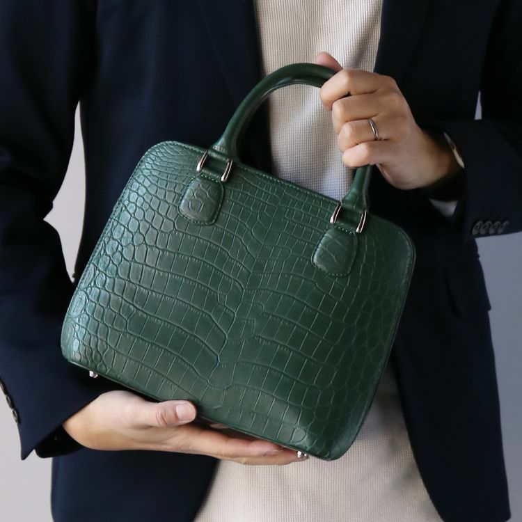 ナイルクロコダイルの美しい表情を活かしつつ艶感を抑えたマット仕上げで落ち着いた高級感のあるハンドバッグ。