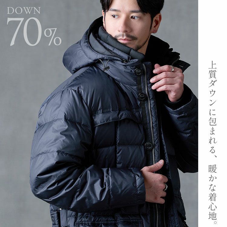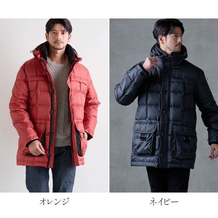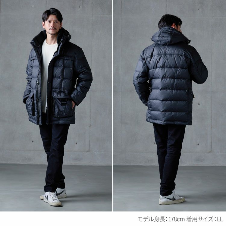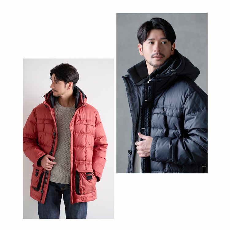 カジュアルからビジネスまで幅広く合わせられるダウンジャケット。 豊富なポケット、優れた防寒性を備えた高機能なアウターです。 ダウンはたっぷりの空気を含んでいます。 空気の層は体温を逃がさず、冷たい外気を遮断します。 そのためダウンは人が快適とする温度を保つことが出来るのです。 タフタとは長繊維の生糸(なまいと)で織られた平織の密度が高い織物の総称で、 その中でも極細な糸を高密度で織り上げたタフタのことを「高密度タフタ」といいます。 高密度タフタは防風性を持ち、保温性・透湿性(蒸れにくい性能)に優れています。 また撥水加工を施していなくても若干の撥水性を兼ね備えており、 テントや傘などにも使われています。 一般的なダウンジャケットより少し大きく作られています。 サイズを選ぶ際は、いつものサイズよりワンサイズ小さいサイズをお勧めします。