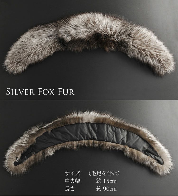 長い毛足でシルバー色の刺し毛と短い褐色の綿毛が美しいコントラストを放つシルバーフォックスを使用。