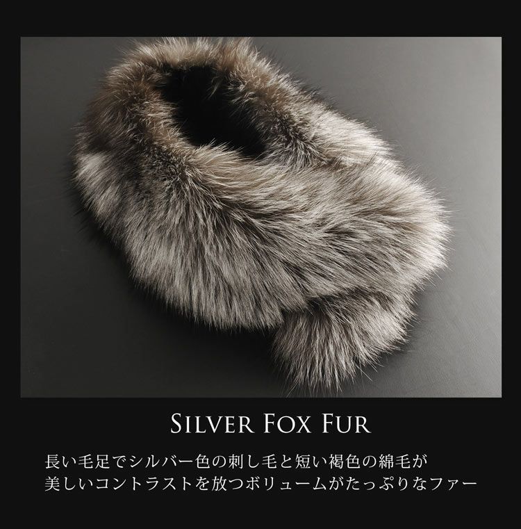 長い毛足でシルバー色の刺し毛と短い褐色の綿毛が美しいコントラストを放つシルバーフォックスを使用。
