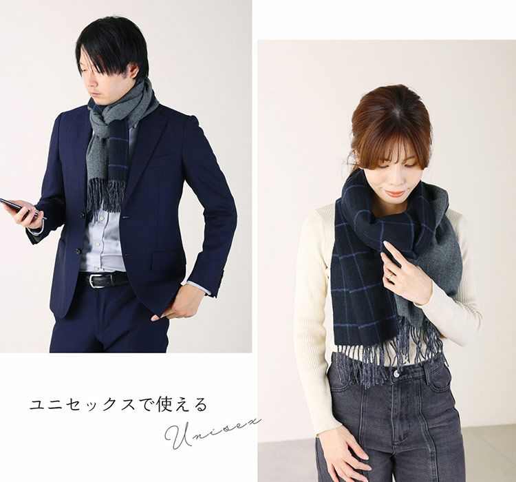 カシミヤ100%を使用したチェックと無地のリバーシブルマフラー。