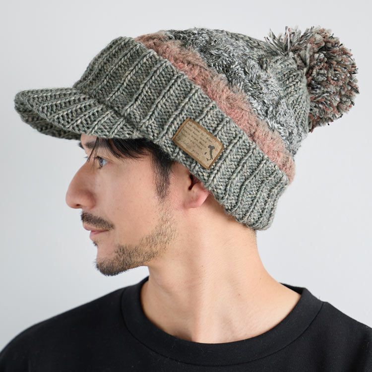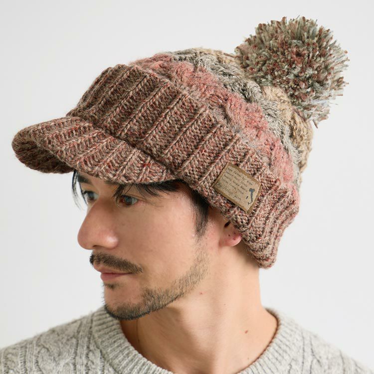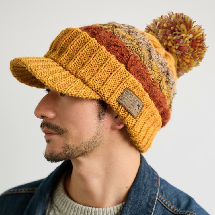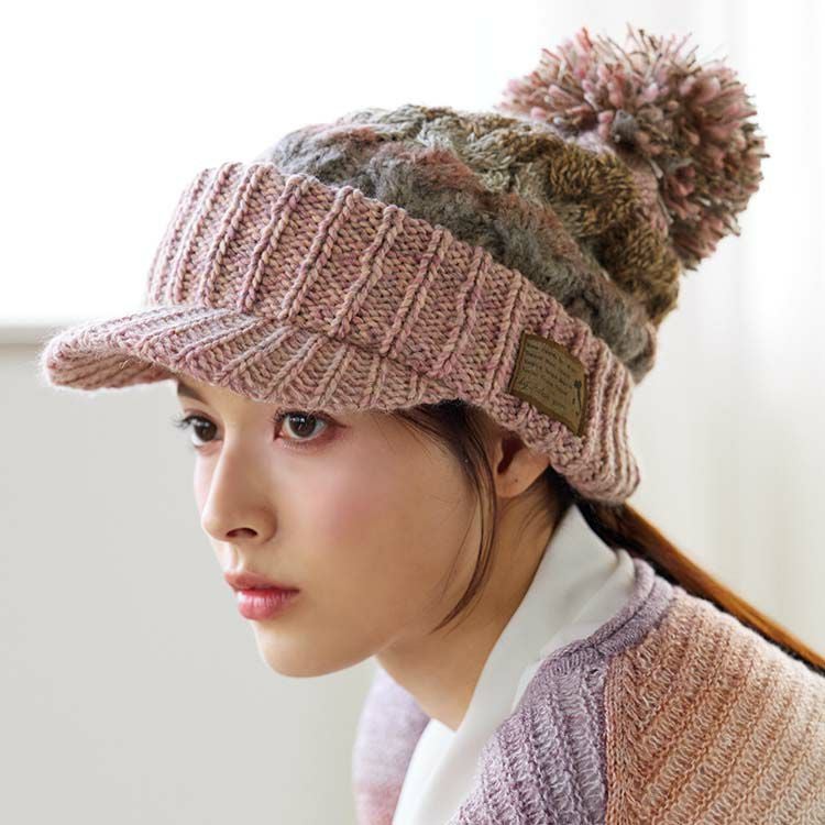 大きめのポンポンがアクセントになった、つば付きデザインのニット帽。