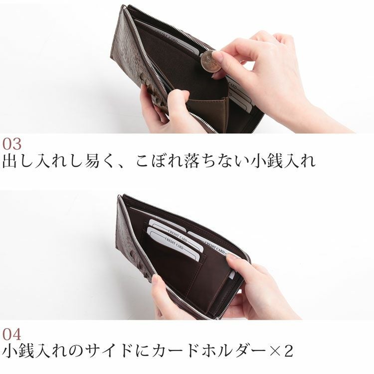 財布を開くとそのまま使える小銭入れは、L字ファスナーを閉じると、小銭が外に飛び出さない造りです。