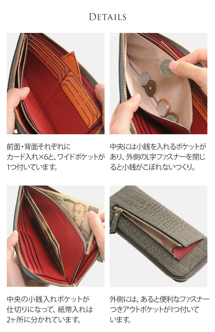 | 素材 | 表側:牛革(クロコダイル型押し)、内装:牛革、一部シャンタン生地 |