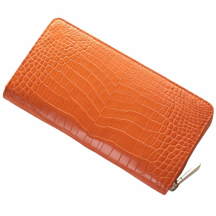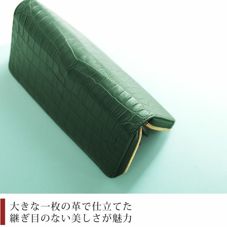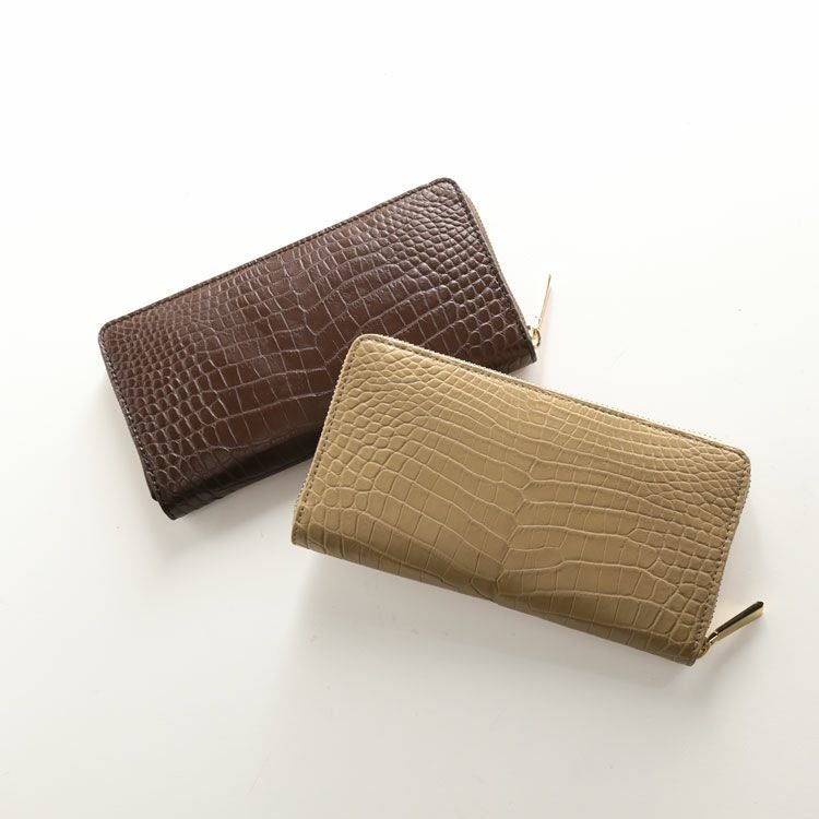 クロコダイルの革をセンター取りの一枚革で使用したラウンドファスナー長財布です。