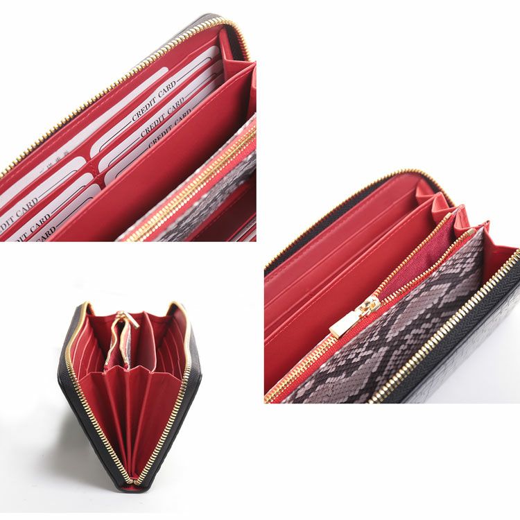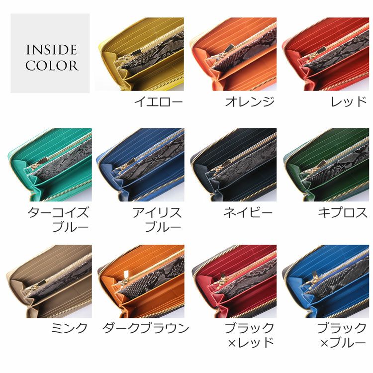 内装のファスナー付き小銭入れの前後にパイソンの革を使用しています。