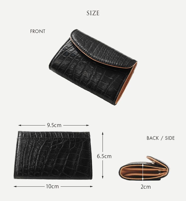 牛革の小銭入れからの買い替えで初めてのクロコダイルを購入しました。 サイズは名刺入れ位でポケットに入れるのにも邪魔にならない大きさで満足してます。 質感はまだ手に馴染んでいないので何とも言えませんがネイビーの色味はとても気に入っています。