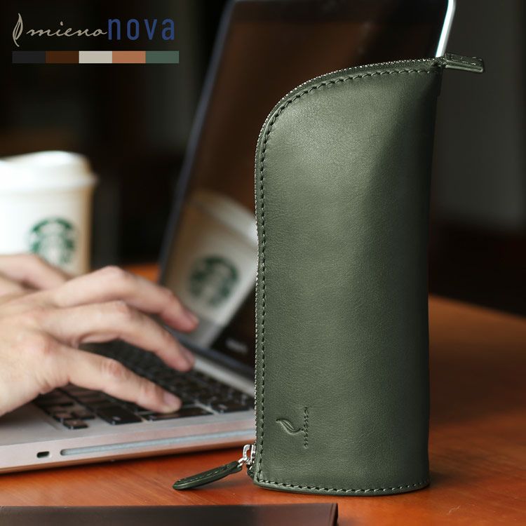 手軽に使える革製品を提案するmienoから、 素材にこだわる大人のための新シリーズ登場。 使っていく人のセンスを格上げしてくれる nova(ノヴァ)レザーペンケースをお楽しみください。 本革ならではの温もりのある風合い。 味のある表情で大人っぽい雰囲気をプラスしてくれます。 デスクの上がすっきり片付く、 ペン立てのように自立するペンケース。 カフェなど限られたスペースでの作業も 場所を取らずに使いやすいアイテム。 メイクブラシや化粧品、メガネなども収納可能。 ポーチとして様々な用途にお使いいただけます。 くたっとした柔らかな質感が特徴のノヴァレザー。 ナチュラルテイストな風合いで上品な印象。 長く愛用したくなる味わいのある革。