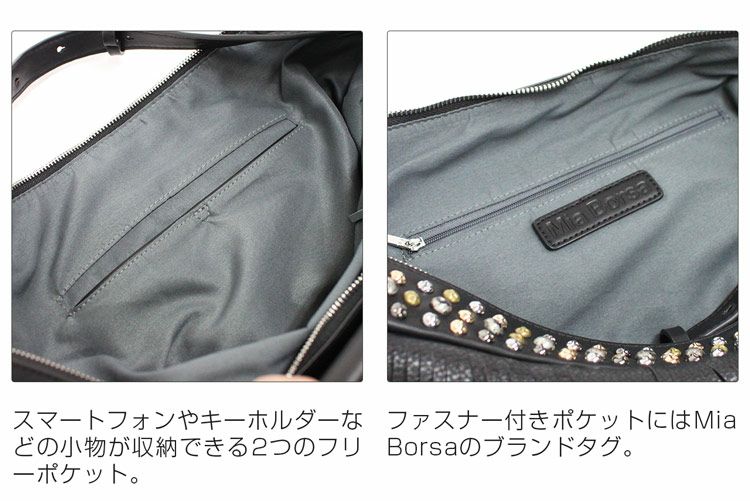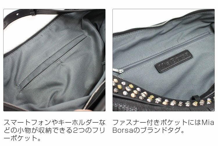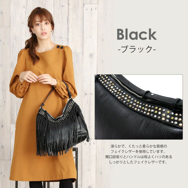 Mia Borsa フリンジバッグ ショルダーバッグ レディース ブランド PU 軽い フェイクレザー スタッズ付 大きめ 鞄 黒 ワンショルダー ハンドバッグ 肩掛け ギフト プレゼント