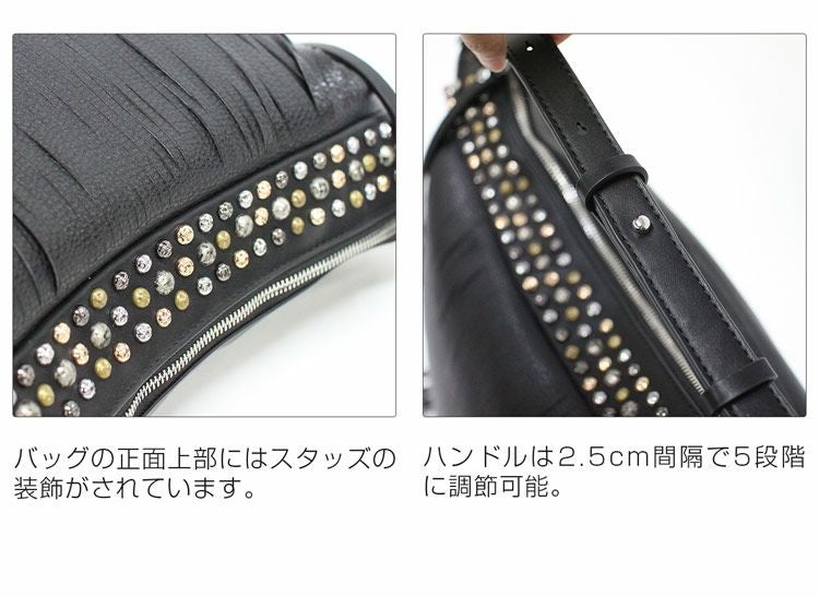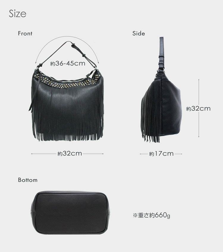 バッグの前面にスタッズとフリンジがデザインされたワンショルダーバッグ。