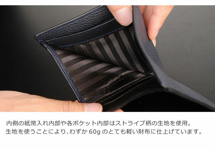 紙幣入れ内部や各ポケットの内部は生地を使用し、軽量を実現。
