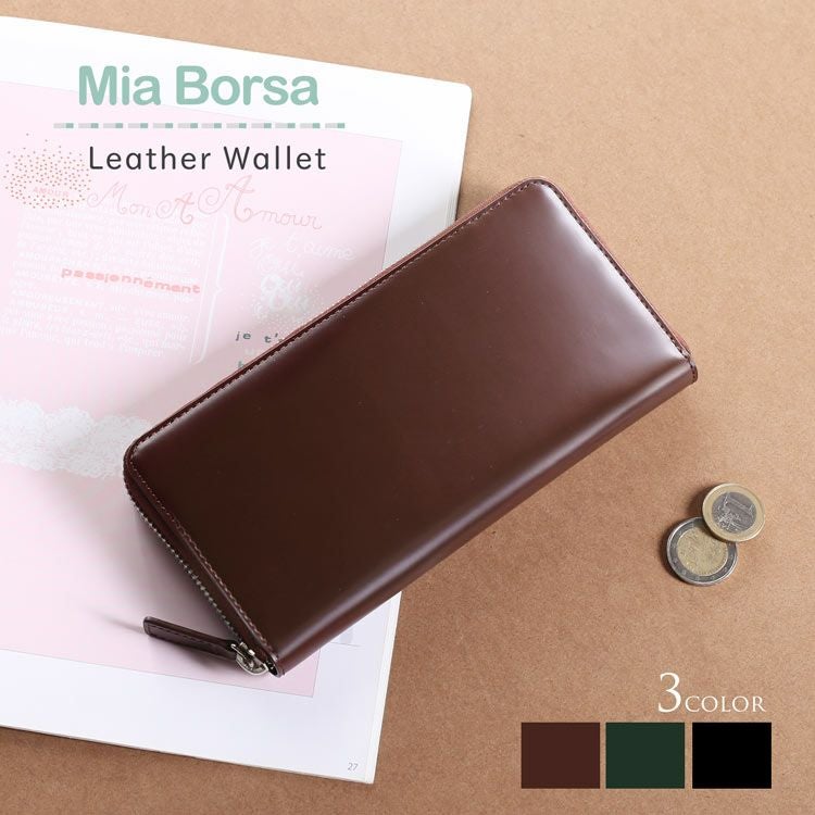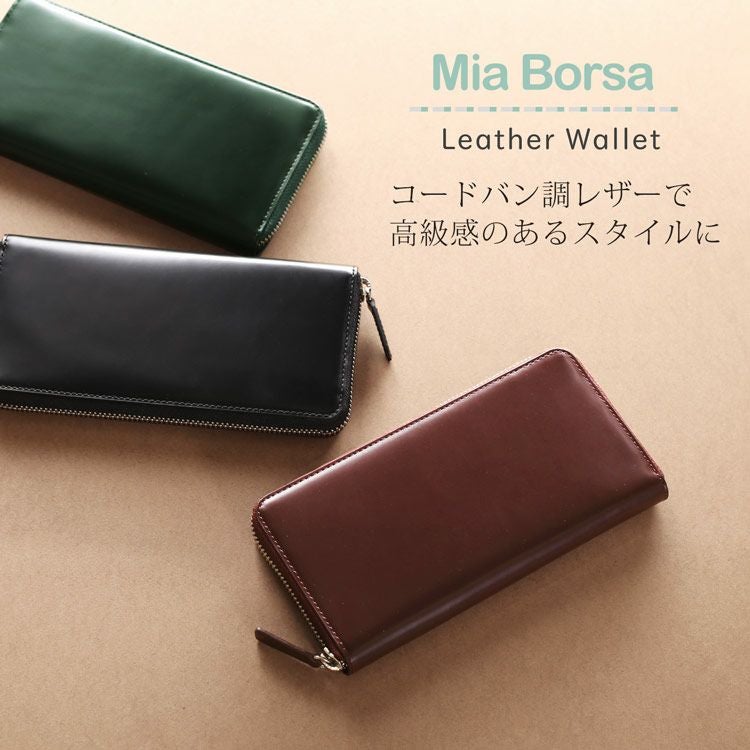 本革 レディース 長財布 ラウンドファスナー コードバン調 レザー Mia Borsa ワイン/グリーン/ブラック女性 プレゼント 卒業 記念品 春財布