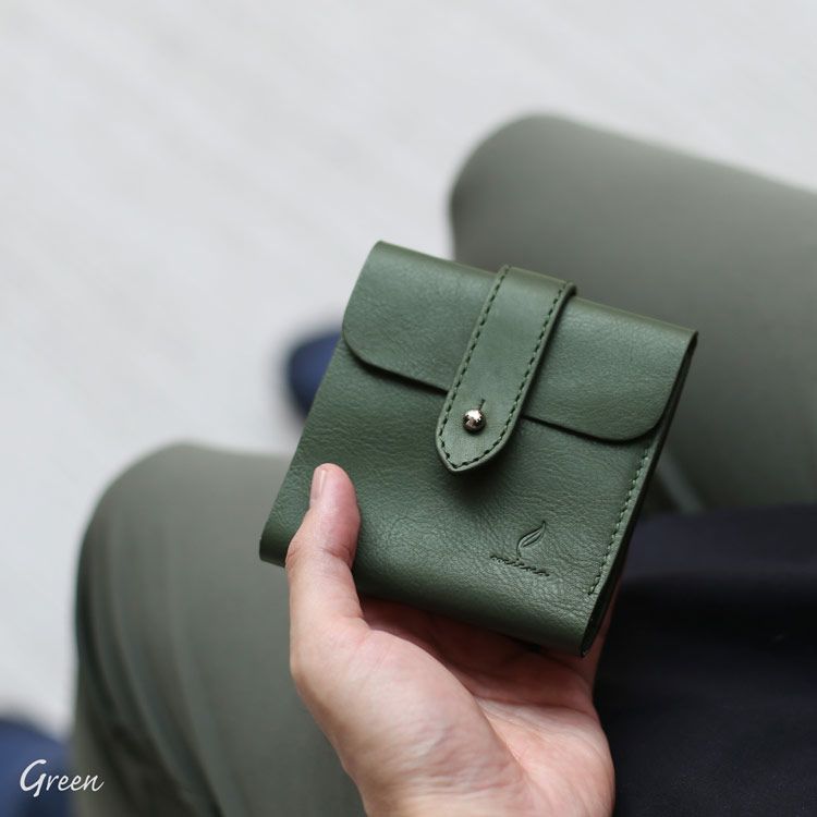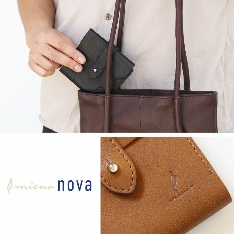 手軽に使える革製品を提案するmienoから、 素材にこだわる大人のための新シリーズ登場。 使っていく人のセンスを格上げしてくれる nova(ノヴァ)レザー折り財布をお楽しみください。 本革ならではの温もりのある風合い。 味のある表情で大人っぽい雰囲気を プラスしてくれます。 くったり柔らかな革が手に馴染んで心地いい。 革の素朴な風合いを楽しめる シンプルデザインの折り財布。 お財布を開くと左側にカードホルダーが3つ、 右側にはポケットが1つと、小銭入れがあります。 小銭入れはスナップボタンで開閉し、 マチ付きなので中身の出し入れもしやすいです。 柔らかな革なので紙幣入れが がばっと大きく開きます。 中の確認がしやすく出し入れも しやすいのが嬉しいポイントです。 カードホルダーの下にチケット類を 挟んでおけるスペースがあります。 切符などの小さなものはもちろん、 大きめのクーポンや領収書など、 一時保管するのに便利なスペースです。 くたっとした柔らかな質感が特徴のノヴァレザー。 ナチュラルテイストな風合いで上品な印象。 長く愛用したくなる味わいのある革。 表面は一枚のノヴァレザーで仕立てています。 革の質感を存分に楽しめるシンプルな作りです。