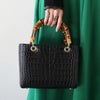 型押しを施したイタリアンレザーは、模様の出方が一つひとつ異なり、深みのある艶が魅力。立体感のある仕上がりが重厚感を引き立てます。ハンドル部分には天然バンブーを使用し、軽やかで丈夫。さらに使うほどに艶を増し、経年変化の味わいを楽しめます。