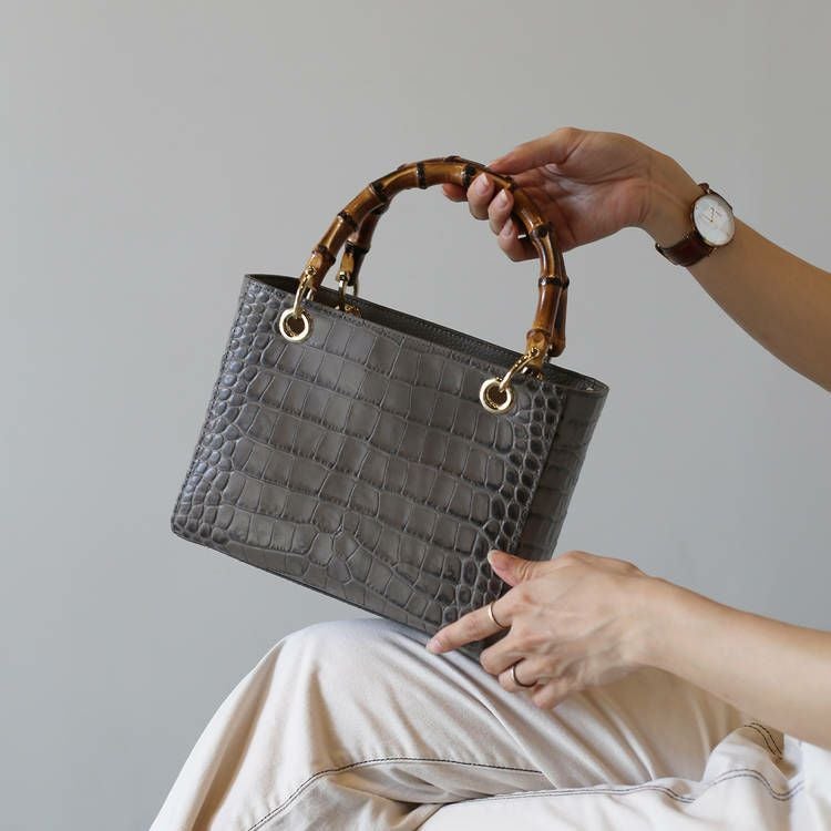 型押しイタリアンレザーは深みのある艶と立体感が魅力。天然バンブーハンドルは一つひとつ表情が異なり、使うほどに艶を増して味わいを深めます。
