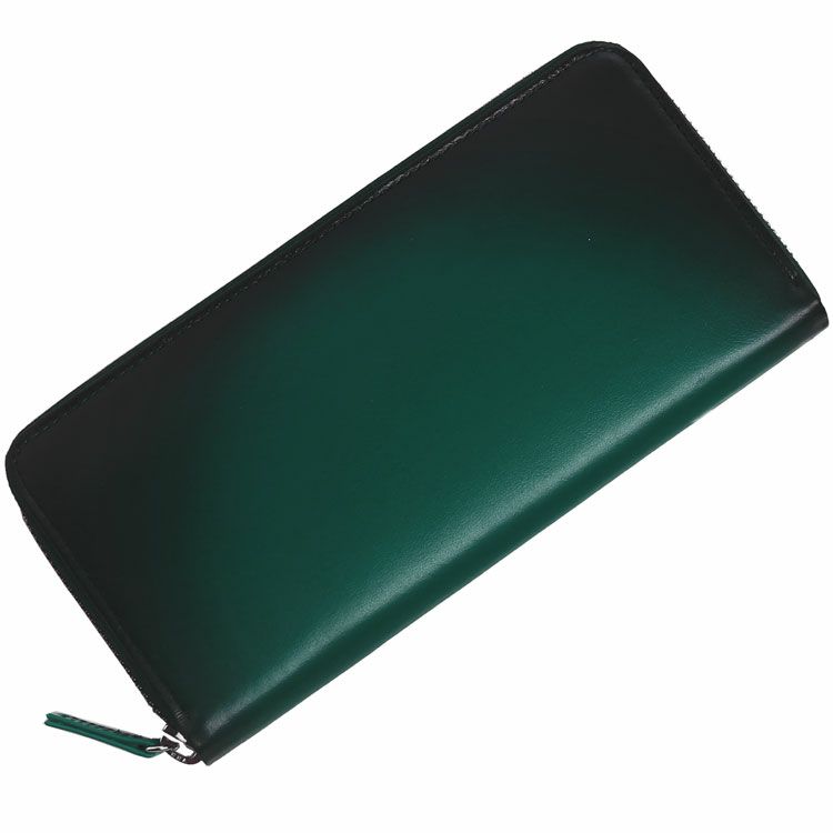 表革には日本職人の手作業によるシャドー加工を施した革を用いています。 型抜きした革1枚1枚に職人の手作業でエアーブラシによって吹き付けを施しています。 端から中央へ滑らかな濃淡を出していく作業は、職人の経験と技術のなせる業です。 硬く見えるデザインですが、使用している牛革はソフトで滑らかな手触りの牛革を使用。 思わず触れたくなる手触りと美しいグラデーションが魅力の財布です。 手に馴染む柔らかな触り心地。 美しいグラデーションが手元をオシャレに飾ります。 内装にMADE IN JAPANの文字が刻印されています。 日本製品の魅力として第一に挙げられるのが「作りの良さ」です。 日本特有の細やかで正確な作業は、 海外の職人には真似る事のできない日本が誇る伝統的な技術の一つです。 また、この緻密で正確な隙の少ない作りにより製品の耐久性が高く、 長く使えるというメリットがあり、世界中から日本製品はリスペクトされています。 開口部はラウンドファスナーで『コの字』型に大きく開きます。 内装は2つの紙幣入れと片マチファスナーの小銭入れで構成されています。 内側の前面と背面にカードホルダー×6とワイドポケット×1がそれぞれ付いています。 中央の小銭入れは片マチで大きく開き、小銭が取り出しやすい工夫が施されています。 専用の箱に入れてお届けします。 プレゼントにもおすすめのアイテムです。