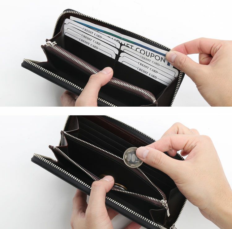 ラウンドファスナーでコの字型に大きく開くファスナー長財布です。