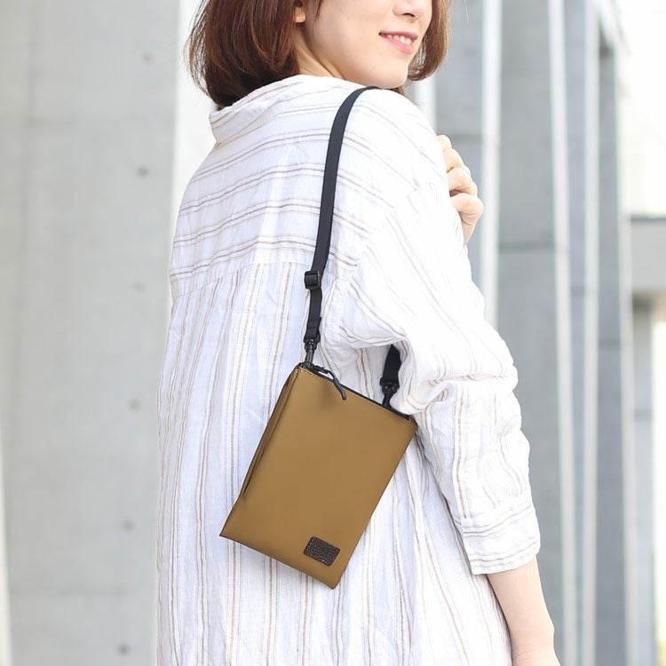 落ち着いたシンプルなデザインであらゆるコーディネイトに合わせられる万能なサコッシュ。