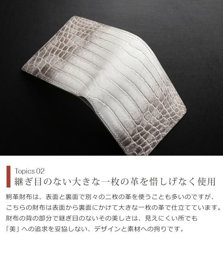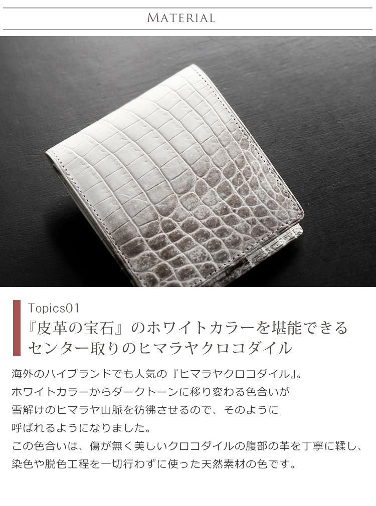 他の画像を見る exotic leather ヒマラヤ クロコダイル 二つ 折り財布 メンズ 日本製 無双 一枚革 センター取り マット 加工 JRA 4FA ¥ 74,800 税込 4.00 (1件) お気に入りに登録する