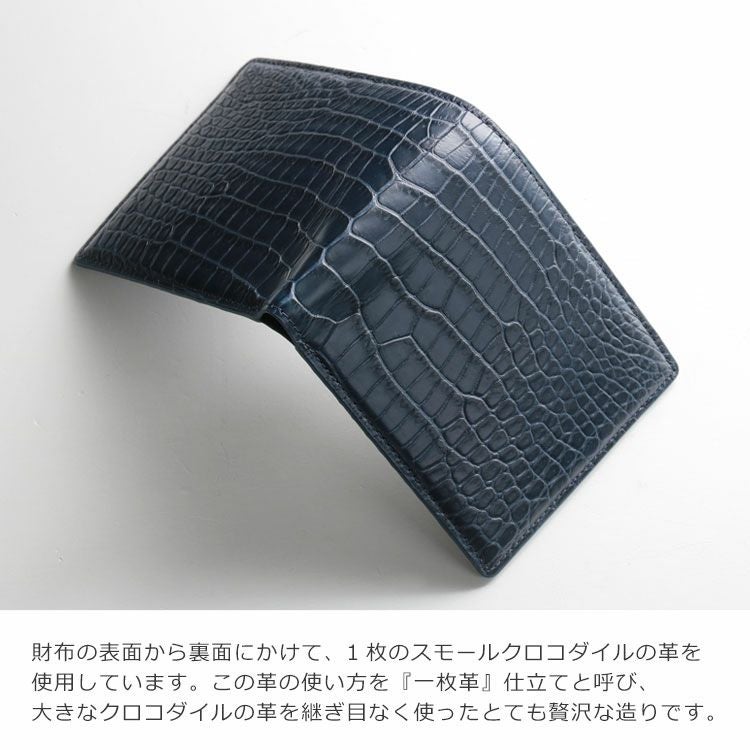 スモールクロコダイルで仕立てた二つ折り財布です。
