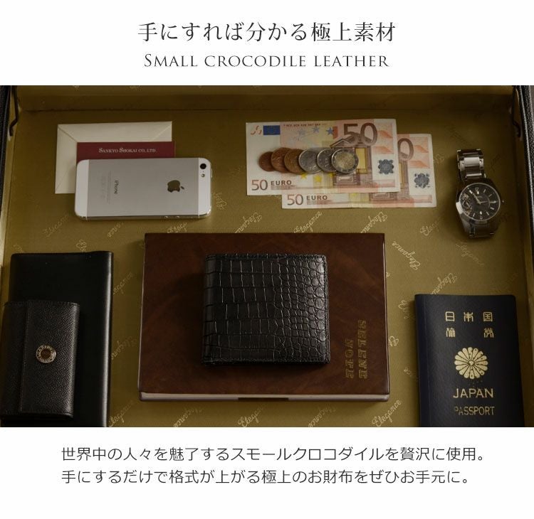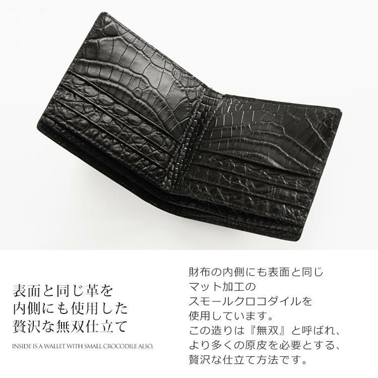 スモール クロコダイル 二つ 折り財布 メンズ マット 加工 一枚革 センター取り 無双 両カード『クロコダイル保証書付き』 4FA