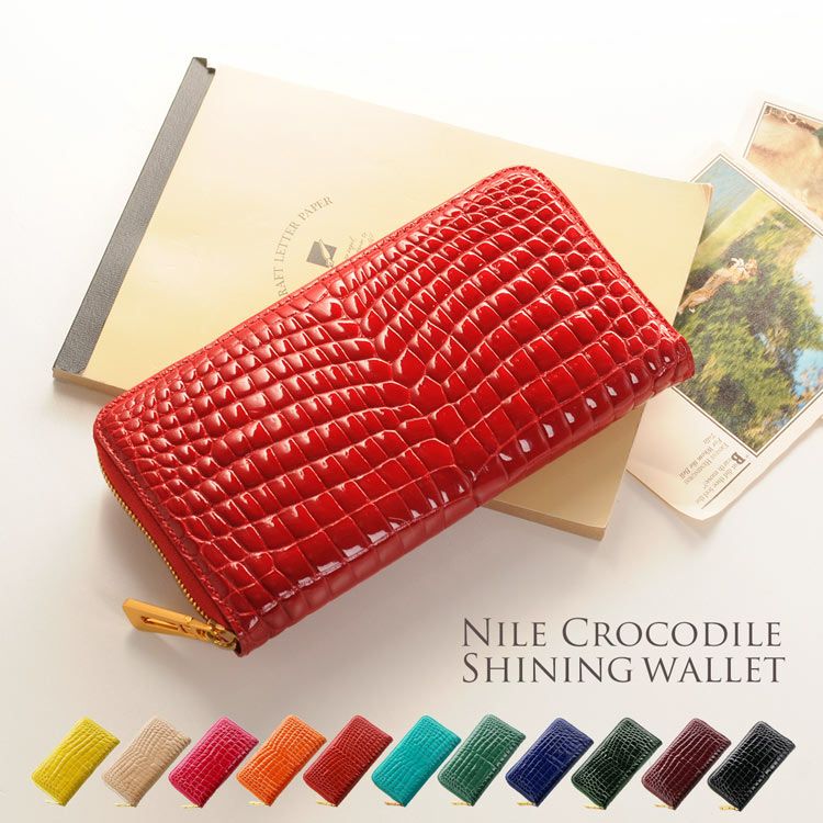 天然皮革 エキゾチックレザー クロコダイル 長財布 シャイニング加工 一枚革 センター取り レディース ヘンローン 真鍮 チャーム 全20色 本革 ナイル 安心 保証書 付き 女性 プレゼント 春財布 ギフト