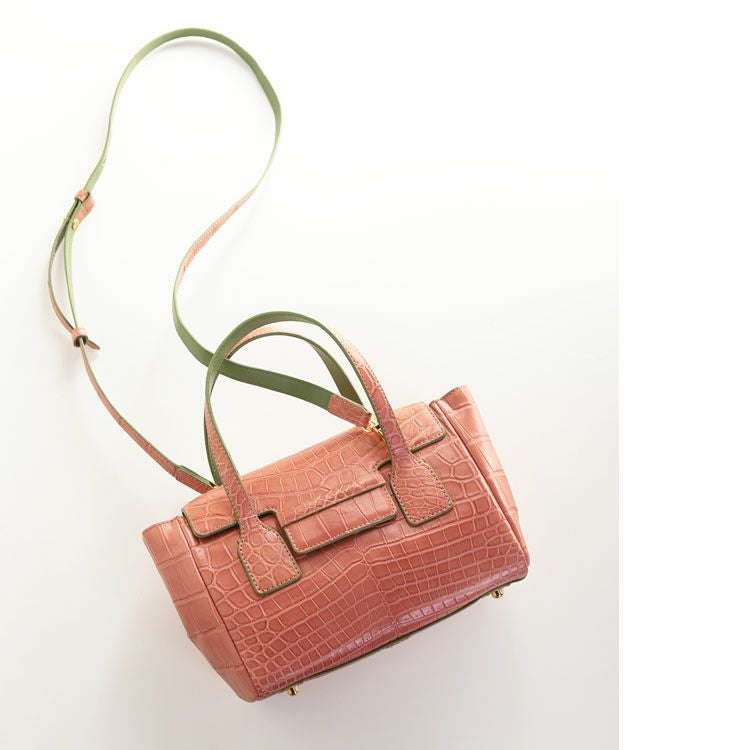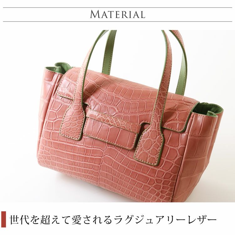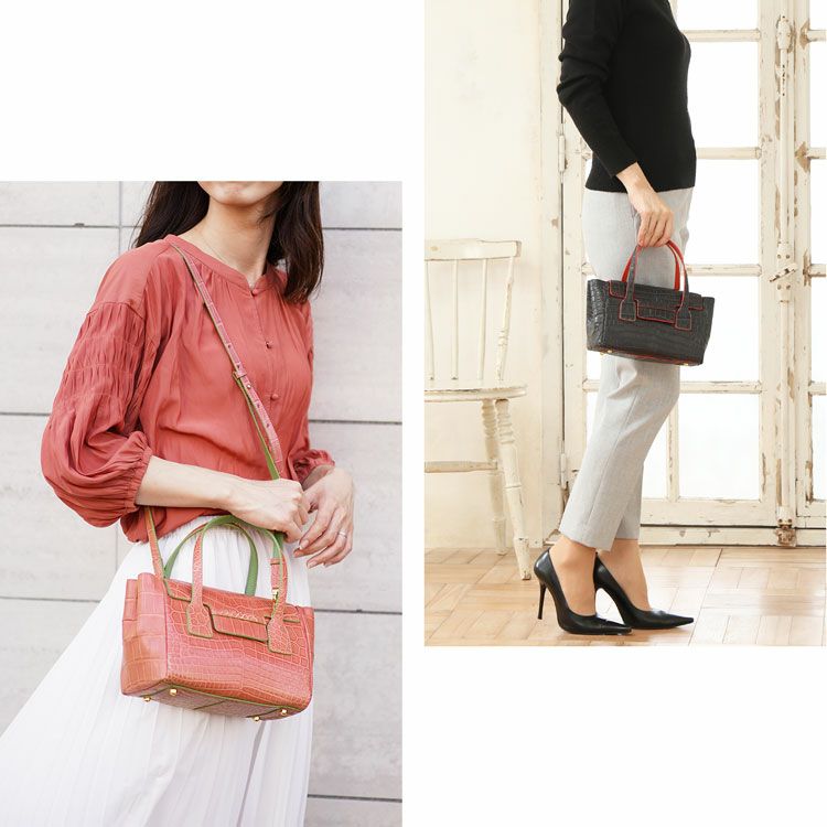 素材はクロコダイルとラムレザーのバイカラーで、女性の装いに可愛らしくてラグジュアリーな印象をプラスしてくれます。
