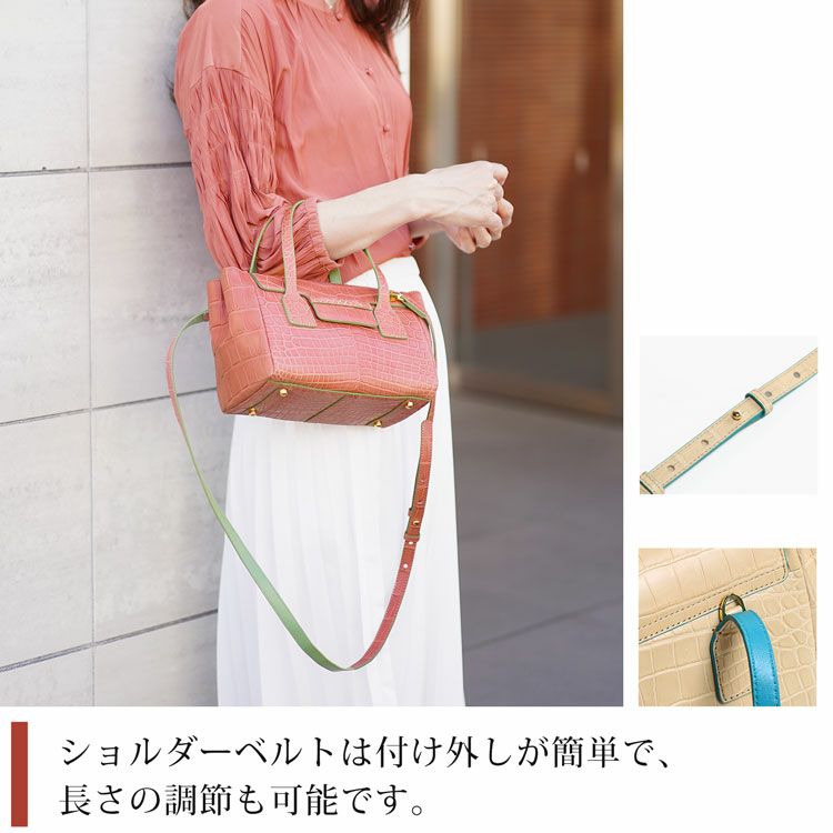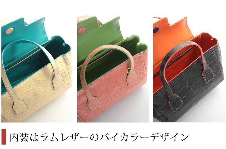 | 商品名:クロコダイル 2WAY ミニ ハンドバッグ マット 加工 センター取り 本革 ミニバッグ バイカラー 内装 ラムレザー |