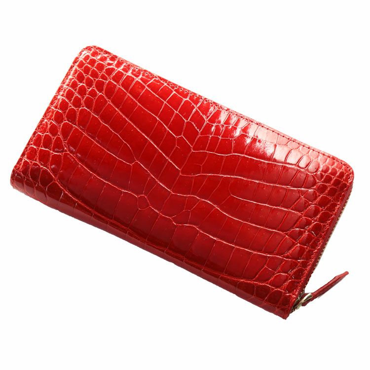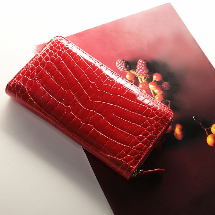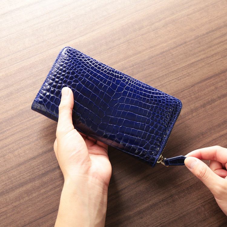 クロコダイルの革をセンター取りの一枚革で使用したラウンドファスナー長財布です。