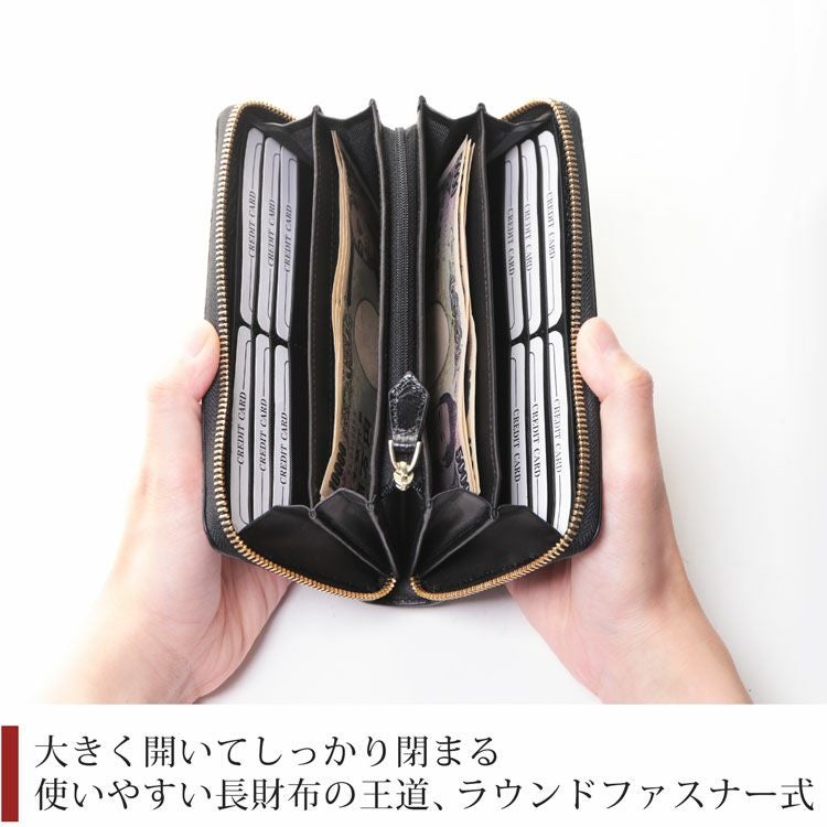 開口部のファスナーが『コ』の字型に大きく開くラウンドファスナー式の長財布です。