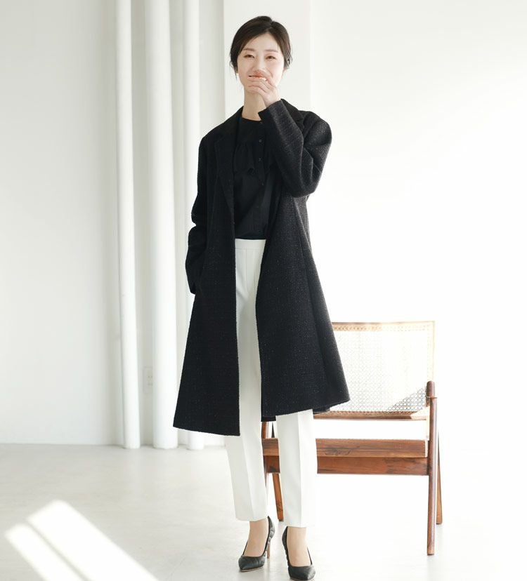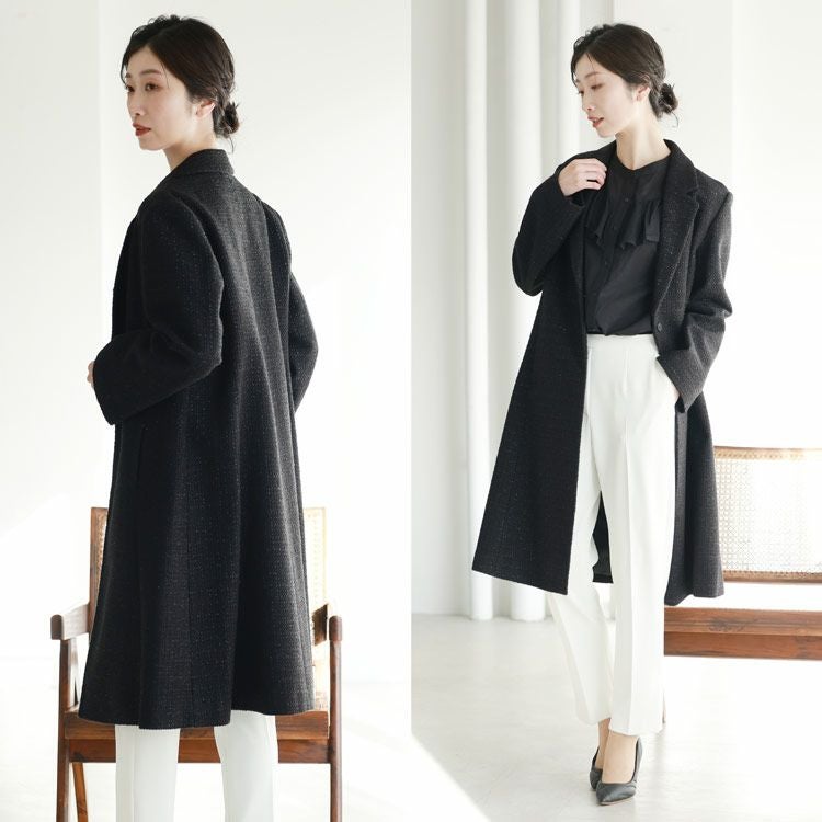 上品にキラキラ輝くラメが入ったラメツイード生地を使用したテラーカラーチェスターコート。