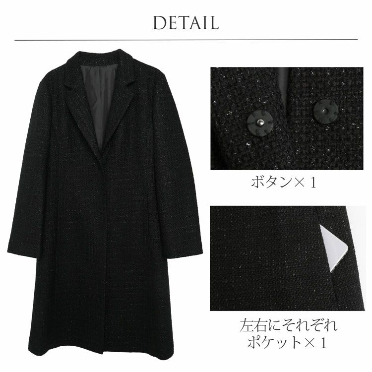 他の画像を見る sale 卒園式 卒業式におすすめ ノーカラー コート レディース Vネック J-white ブラック ラメ ツイード 生地 秋 冬 6F 通常価格 ¥ 19,800 SALE価格 ¥ 17,820 税込 (0件) お気に入りに登録する