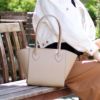 シンプルで使いやすい、大人の女性のためのきれいめトートバッグです。プライベートだけでなく、お仕事バッグとしても最適なサイズ感で汎用性抜群です。底鋲もついているので、床に置く時も汚れの心配がありません。