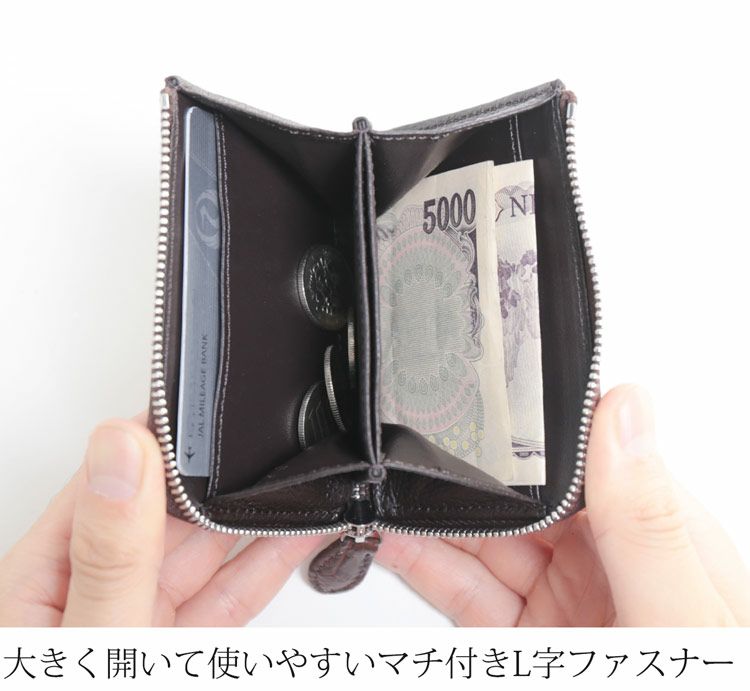 大きく開くL字ファスナーで使いやすさ抜群の小銭入れです。