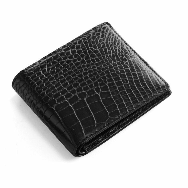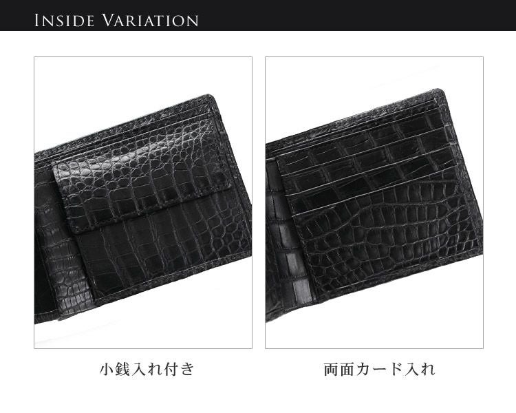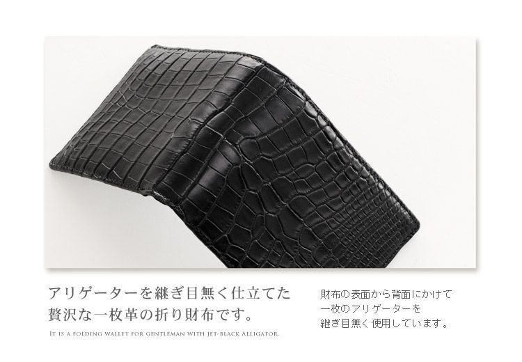 アリゲーターを表面から背面まで一枚革で使用した贅沢な無双仕様のメンズ二つ折り財布。