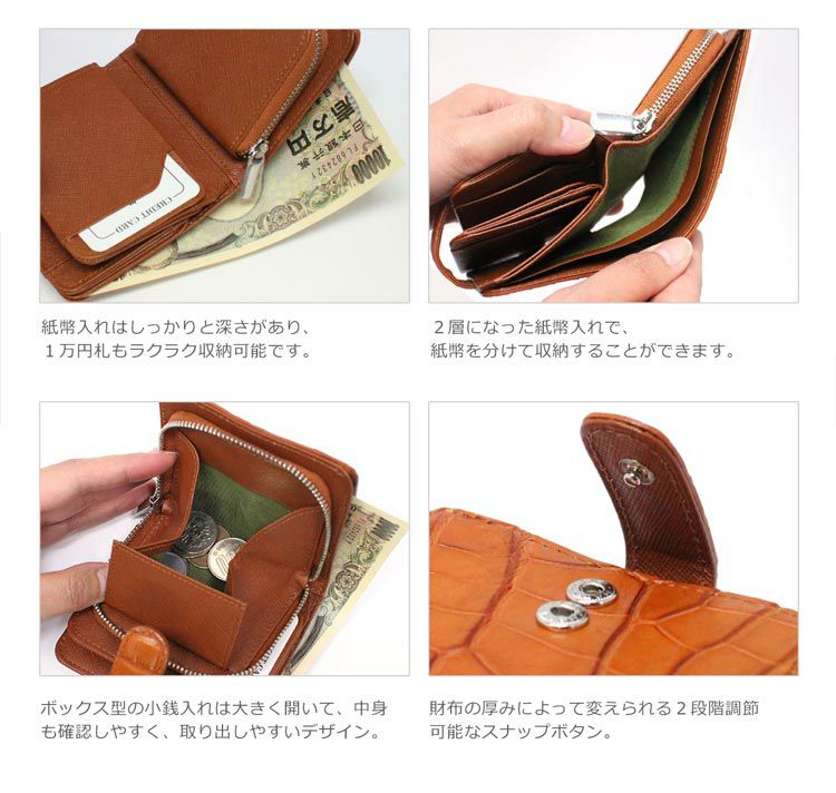 コンパクトな財布に変えようと十数年ぶりに二つ折り財布を候補に挙げ子供っぽくならないように初めてクロコダイルにしてみました。予想以上に使い易く高級感もあり大切にしています。小銭部分の収納も良くカ-ドも取り扱いしやすいです。必要以上にカ-ドを持たないので欲を言えばカ-ド収納部分が1つ少なくても良いかなと・そのため、思い切って一つ切り取りました。それでも免許証など自分が所有するものはきれいに収まっています。一つ外したことで財布事態の膨らみもスッキリしています。