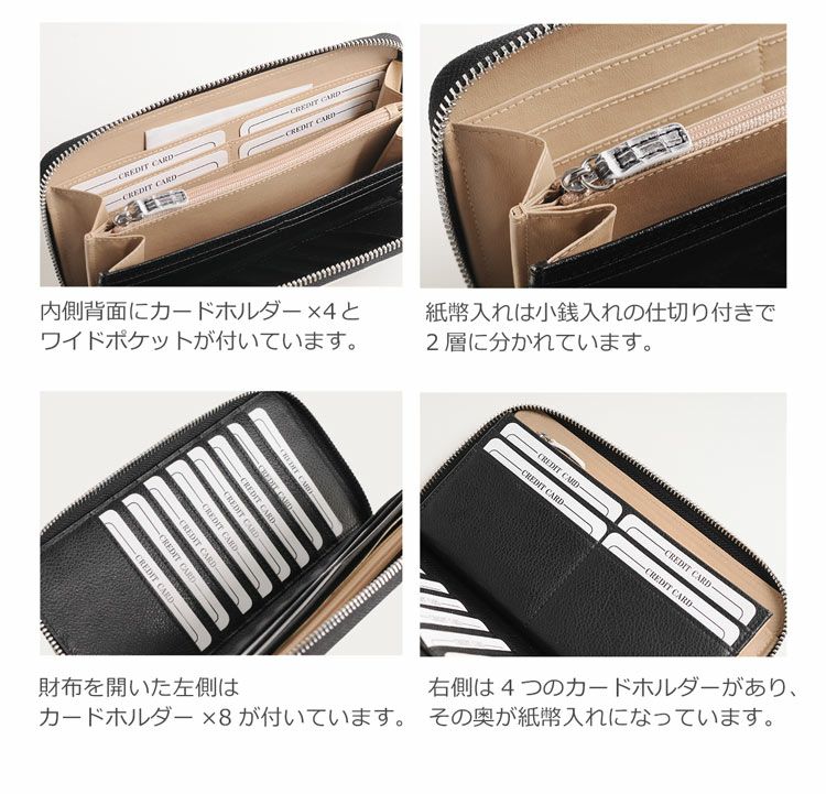 | 内側収納 | ・紙幣入れ×2 ・ファスナー式小銭入れ×1 ・カードホルダー×16 ・ワイドポケット×1 |