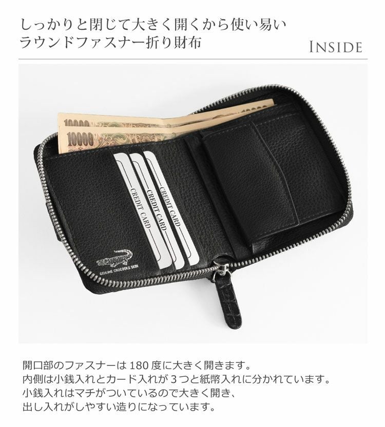 天然皮革 エキゾチックレザー クロコダイル ラウンドファスナー 二つ折り財布 メンズ 折り財布 シルバー金具 マット加工 背面ポケット付 メンズ財布 本革 革 プレゼント ギフト 普段使い 父 ギフト