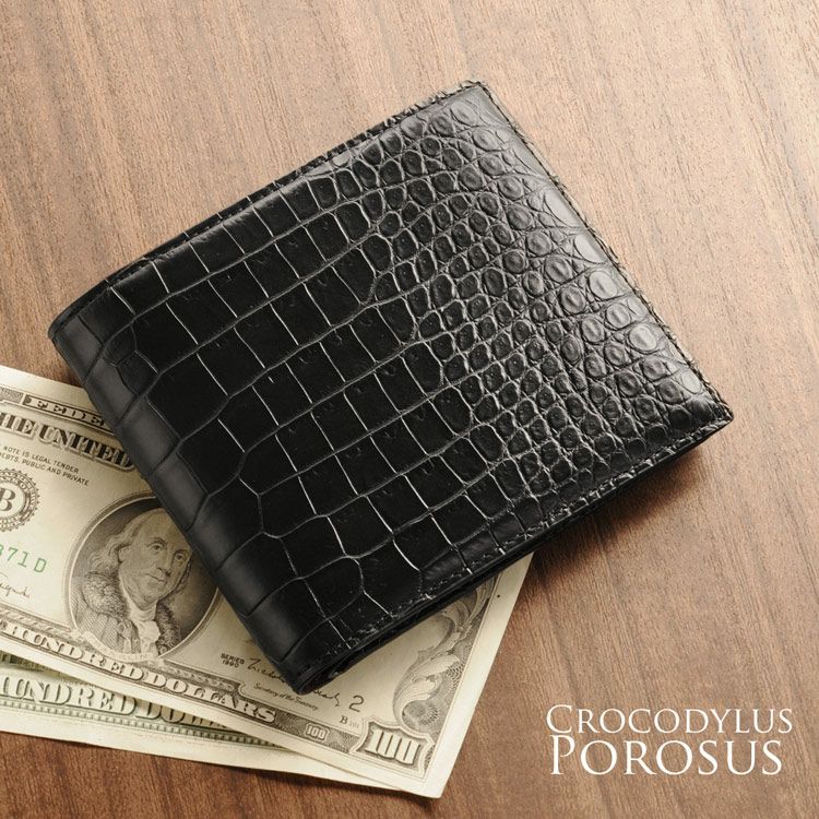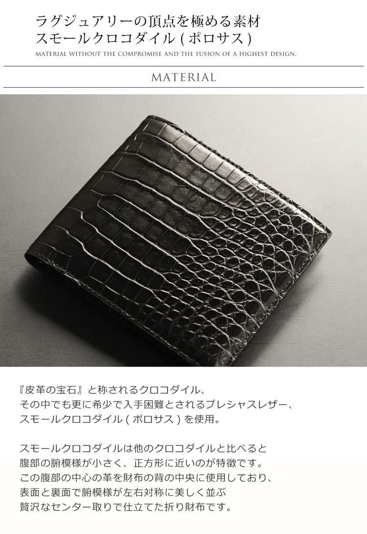 天然皮革 エキゾチックレザー スモール クロコダイル 折り財布 マット 加工 センター取り 一枚革 ポロサス 無双 横幅11.5cm メンズ 保証書 付き 本革 プレゼントギフト