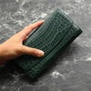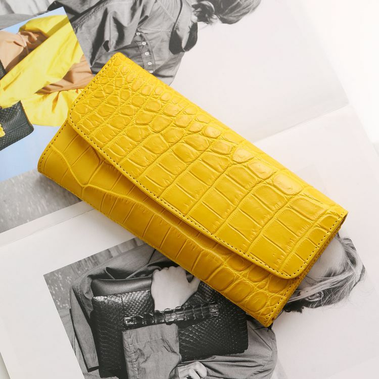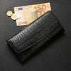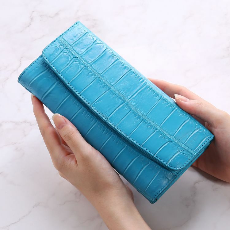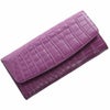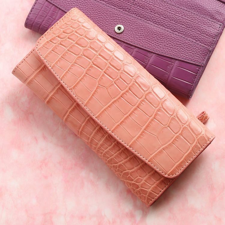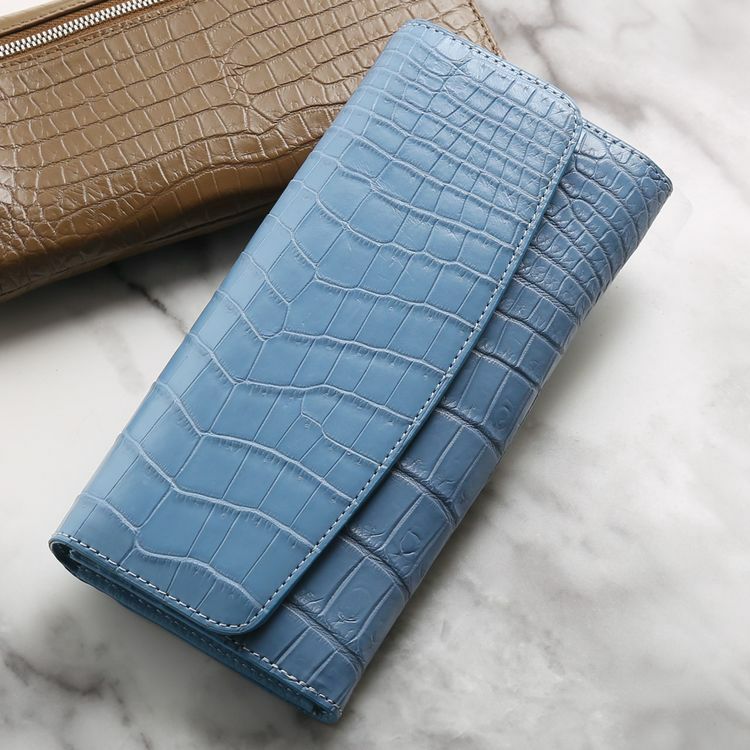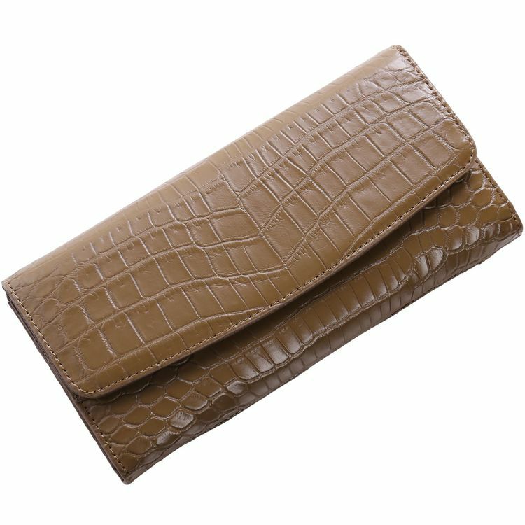 豊富なポケットを備えたかぶせ開閉の扱いやすいクロコダイル長財布。