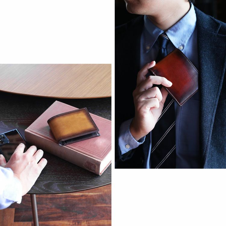 1980年代にデザイナーのアルバート・アミデイの指導の下、 職人たちの新たな拠点として、Antony Group Co. Ltdが、 モデナに設立されました。 革新的なデザイナー達のチームワークと協力の元、 高品質な素材を使ったコレクションが次々と生まれ、 2000年代の初めにSilvano Biagini(シルヴァノビアジーニ)という ブランドが設立されました。 以来、Silvano Biagini の製品は、 北イタリアの町モデナにてイタリアの職人たちの 手によって製造されています。 美しいレザーを作り続ける 老舗のイタリアタンナーから仕入れた皮革を用いて、 全ての製造工程をイタリアで行っているブランドです。 古くから美しいレザーを作り続けるイタリアのタンナーが 昔から伝わる伝統的な技術で鞣した牛革を使用しています。 革が本来持つ、血管の跡や小さな傷のようなものは 世界に一つしかないその本革が持つ個性です。 この生きた証を自然に保持したナチュラルレザー、 フルグレインレザーを使っています。 革の表面は濃淡のグラデーションを手作業で施しています。 美しい革本来表情と、イタリアらしい遊び心のある深い色合いで、 愛着を持って長く使いたくなるレザーに仕上がっています。 表面から裏面にかけて、一枚の革で仕立てています。 財布の背の部分に継ぎ目のない、美しい仕上がりです。 内装もイタリア製の牛革を使用しています。 シンプルでオーソドックスな造りで、 財布をスマートに持ちたい方におすすめです。 内側の左側はカードホルダー×4が付いており、 右側はスナップボタン付きの小銭入れになっています。 紙幣入れは二層に分かれています。 カードホルダーや小銭入れの奥に 合計3つのポケットがあります。 ブランド専用の化粧箱に入れて発送します。 大切な人へのプレゼントにもおすすめの二つ折り財布です。 重量:約120g 内装のレザーもイタリア製の牛革を使用しています。
