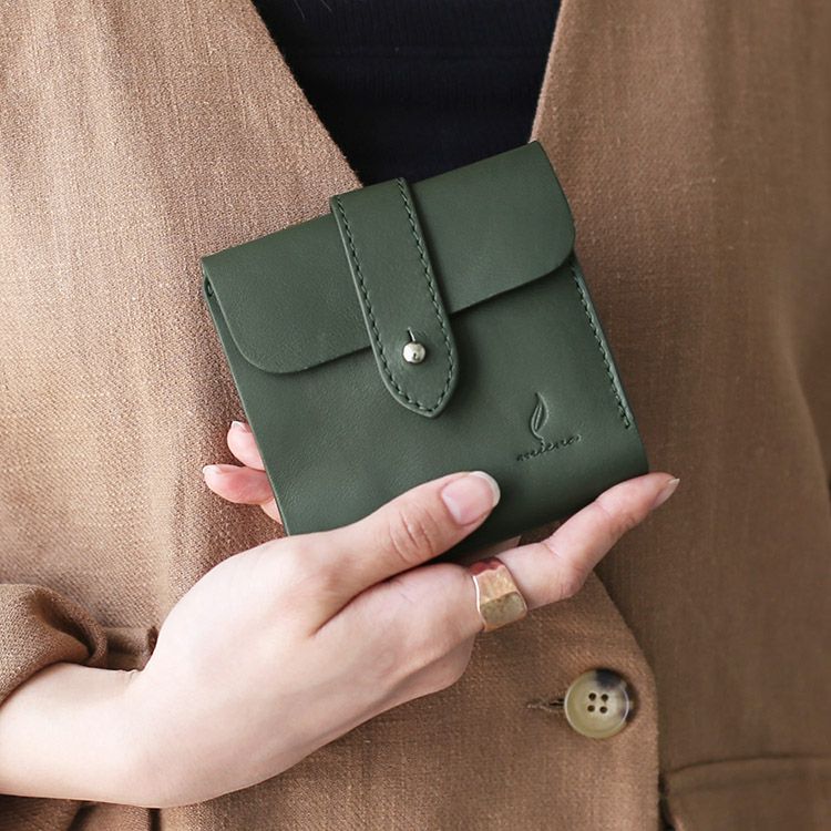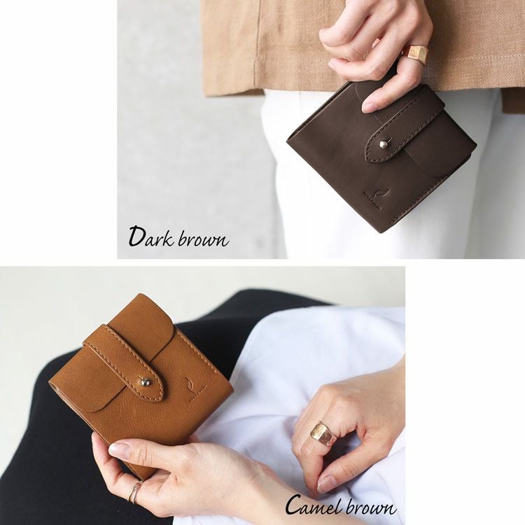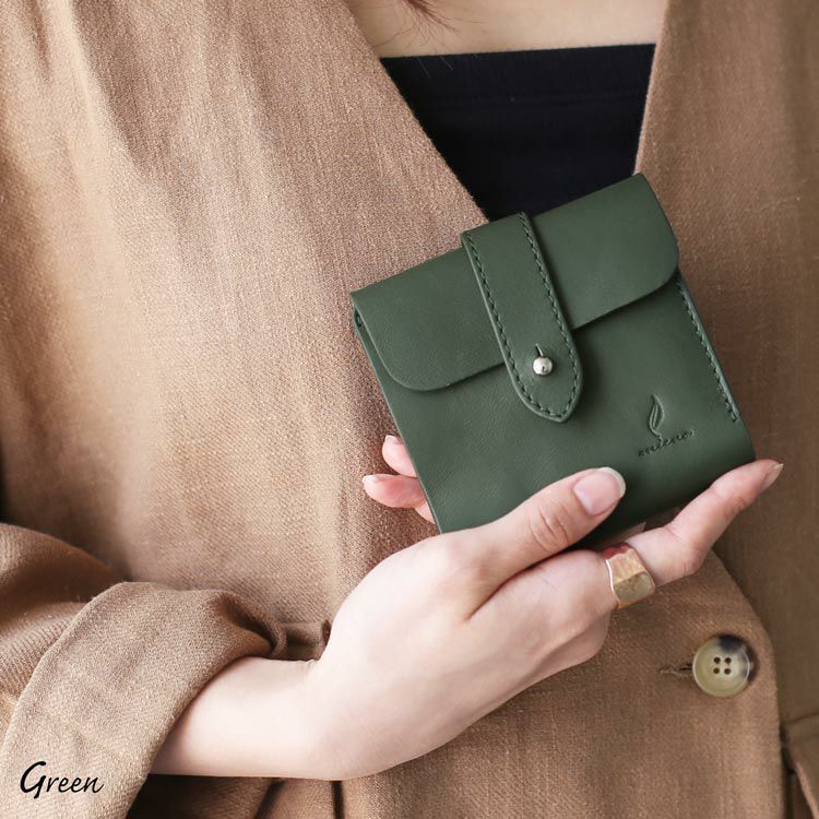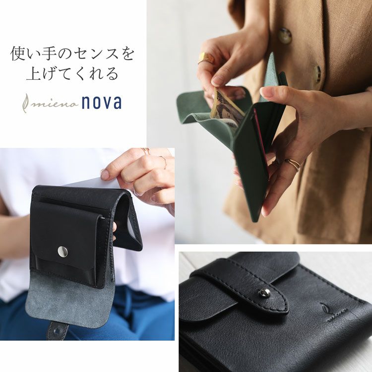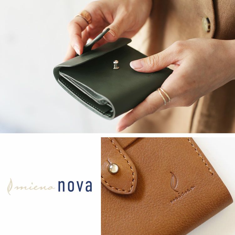 手軽に使える革製品を提案するmienoから、 素材にこだわる大人のための新シリーズ登場。 使っていく人のセンスを格上げしてくれる nova(ノヴァ)レザー折り財布をお楽しみください。 本革ならではの温もりのある風合い。 味のある表情で大人っぽい雰囲気をプラスしてくれます。 くったり柔らかな革が手に馴染んで心地いい。 革の素朴な風合いを楽しめるシンプルデザインの折り財布。 お財布を開くと左側にカードホルダーが3つ、 右側にはポケットが1つと、小銭入れがあります。 小銭入れはスナップボタンで開閉し、 マチ付きなので中身の出し入れもしやすいです。 柔らかな革なので紙幣入れががばっと大きく開きます。 中の確認がしやすく出し入れもしやすいのが嬉しいポイントです。 カードホルダーの下にチケット類を挟んでおけるスペースがあります。 切符などの小さなものはもちろん、大きめのクーポンや領収書など、 一時保管するのに便利なスペースです。 くたっとした柔らかな質感が特徴のノヴァレザー。 ナチュラルテイストな風合いで上品な印象。 長く愛用したくなる味わいのある革。 表面は一枚のノヴァレザーで仕立てています。 革の質感を存分に楽しめるシンプルな作りです。